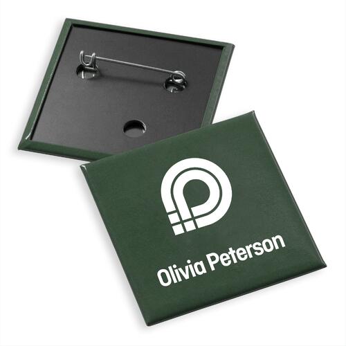- Badges af blik med nål på bagsiden til fastgørelse