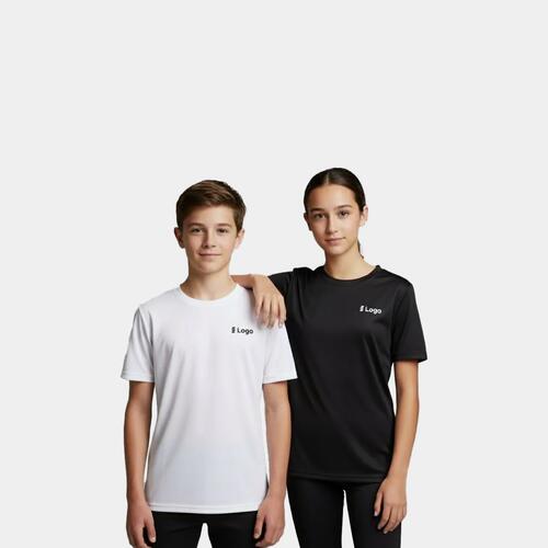 Gråmeleret polyester T-shirt til børn med korte ærmer.