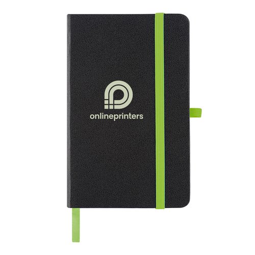 Æblegrøn notesbog med linjerede sider og bogmærkebånd.